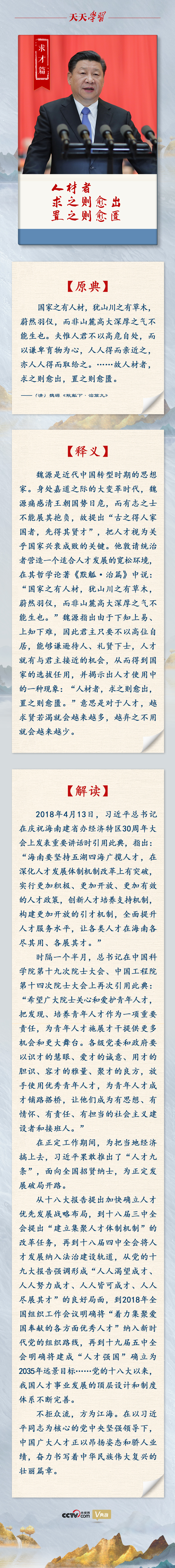 编者按:中央人才工作会议9月27日至28日在北京召开,习近平总书记出席会议并发表重要讲话。党的十八大以来,总书记站在党和国家事业发展全局的战略高度,对我国人才事业发展作出一系列重要指示。在讲话和文章中,他大量引用有关中国古代人才思想的典故,就如何选才、敬才、求才、育才、用才等话题,提出了一系列新思想、新观点、新论断、新要求,为新时代做好人才工作提供了根本遵循和行动指南。《天天学习》带您一起学习回顾。
