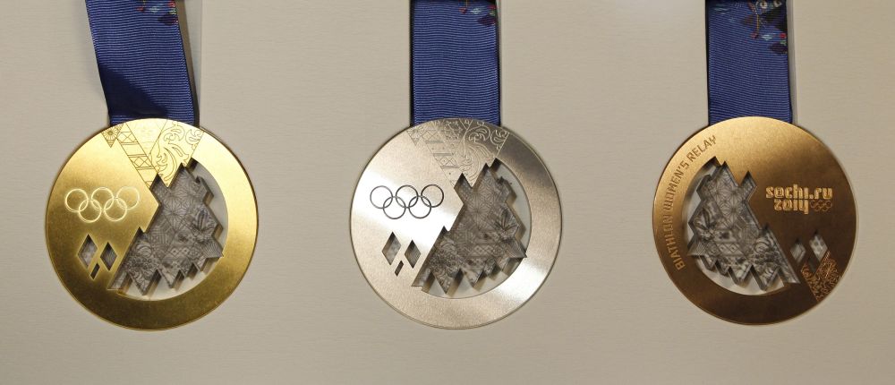 索契冬奥会的奖牌奖牌上可以看到索契的风景沐浴在阳光中,光芒透过皑皑白雪照射到黑海的沙滩上。奖牌正面是奥运五环,背面是竞赛项目英文名称以及2014年索契冬奥会会徽。赛事官方名称以俄语、英语和法语刻在奖牌边缘。