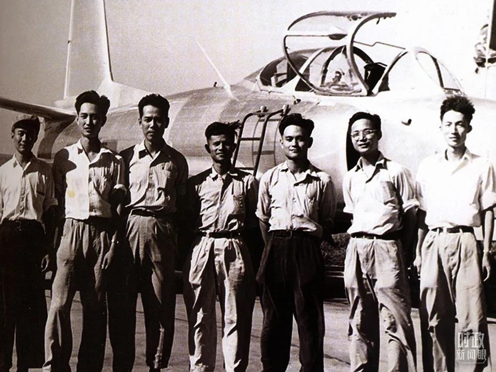 △1958年,顾诵芬(右二)与设计组成员在歼教1飞机前合影。(资料图)