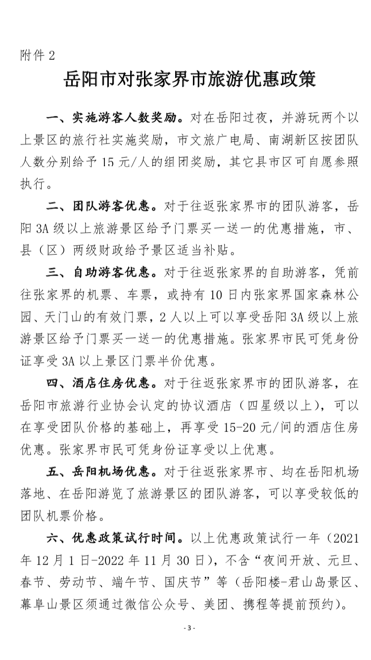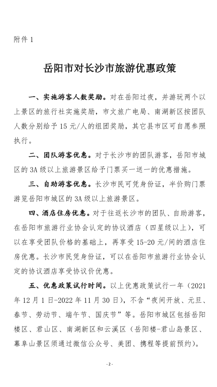 岳阳市文旅部门对外发布消息称,为了加强与长沙市、张家界市的旅游合作,拓展旅游客源市场,将实施游客景区门票半价、酒店住房优惠及奖励旅行社等多项“真金白银”的优惠措施,优惠政策试行一年(2021年 12 月 1 日-2022 年 11 月 30 日),不含“夜间开放、元旦、春节、劳动节、端午节、国庆节”等。具体优惠措施如下图: