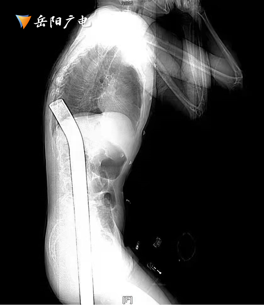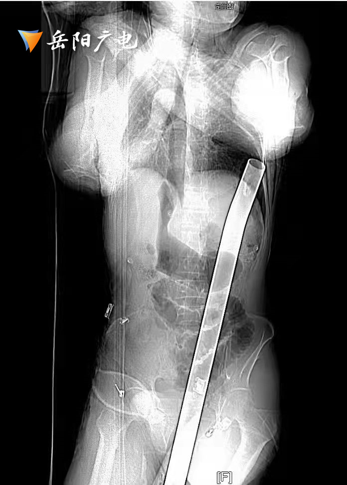 几天前,岳阳县村民刘师傅整理屋顶时,不慎从高空坠落,被1米多长的钢筋贯穿胸腹部。