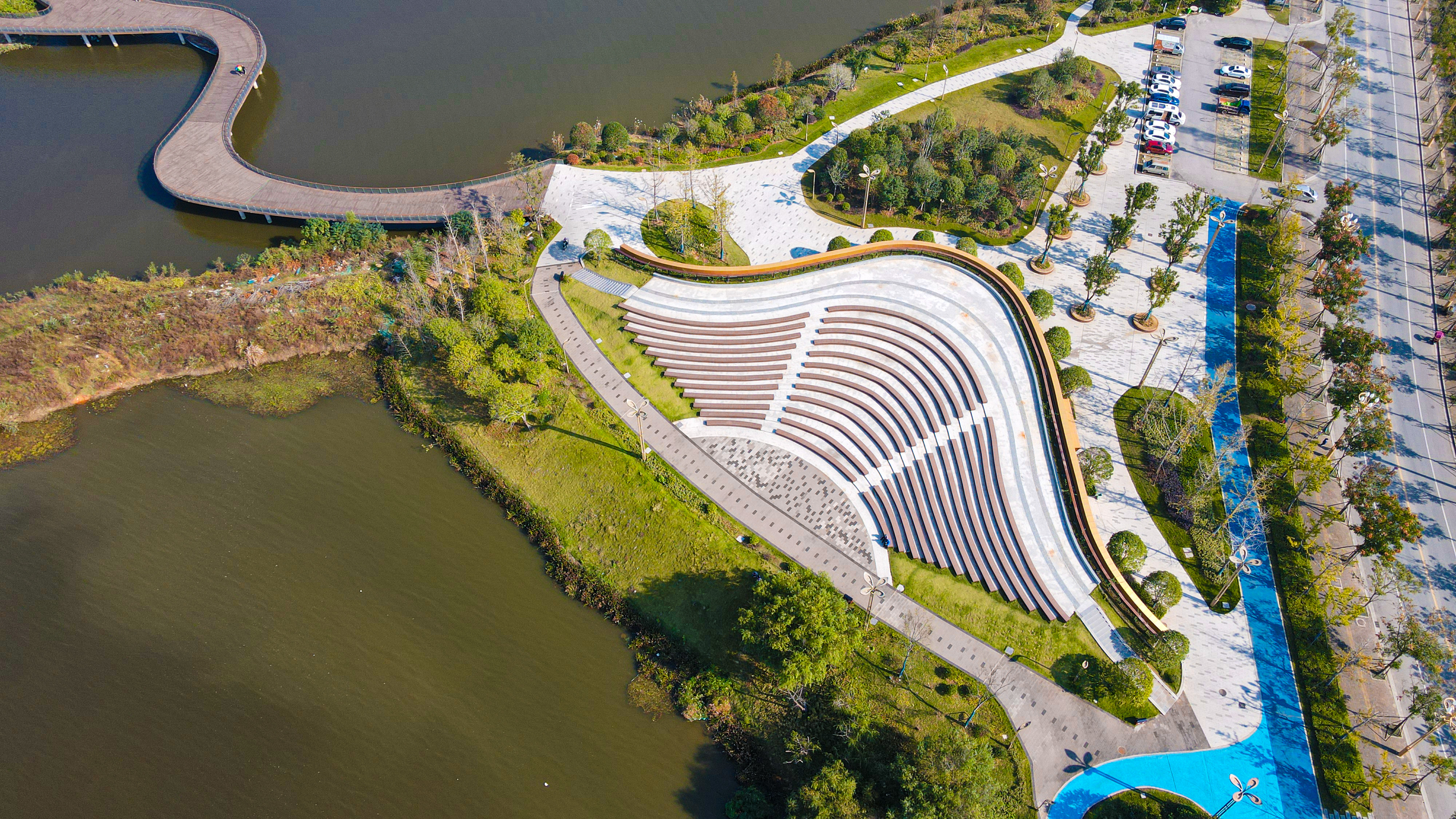 作为临港产业园的配套基础设施建设项目,环松杨湖生态公园坐落于城陵矶松杨湖畔,占地690亩,总投资4124万元,主要包括绿化工程、电气工程、给排水工程,其中建设游步道3.6公里,绿化面积 16万平米。项目以“山水绿肺,江畔明珠”为设计目标,将全区划分为“梦想客厅”“伴湖休闲”“山水生态”“活力森林”四大部分,利用现有资源组织儿童游乐、伴湖长堤、婚庆草坪、潇湘竹林、桃花源里等功能空间,构建出一个充满活力、功能多元、尊重生态的综合性公园系统。