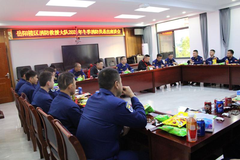 12月6日晚,岳阳市岳阳楼区消防救援大队召开2021年冬季消防员退出座谈会。