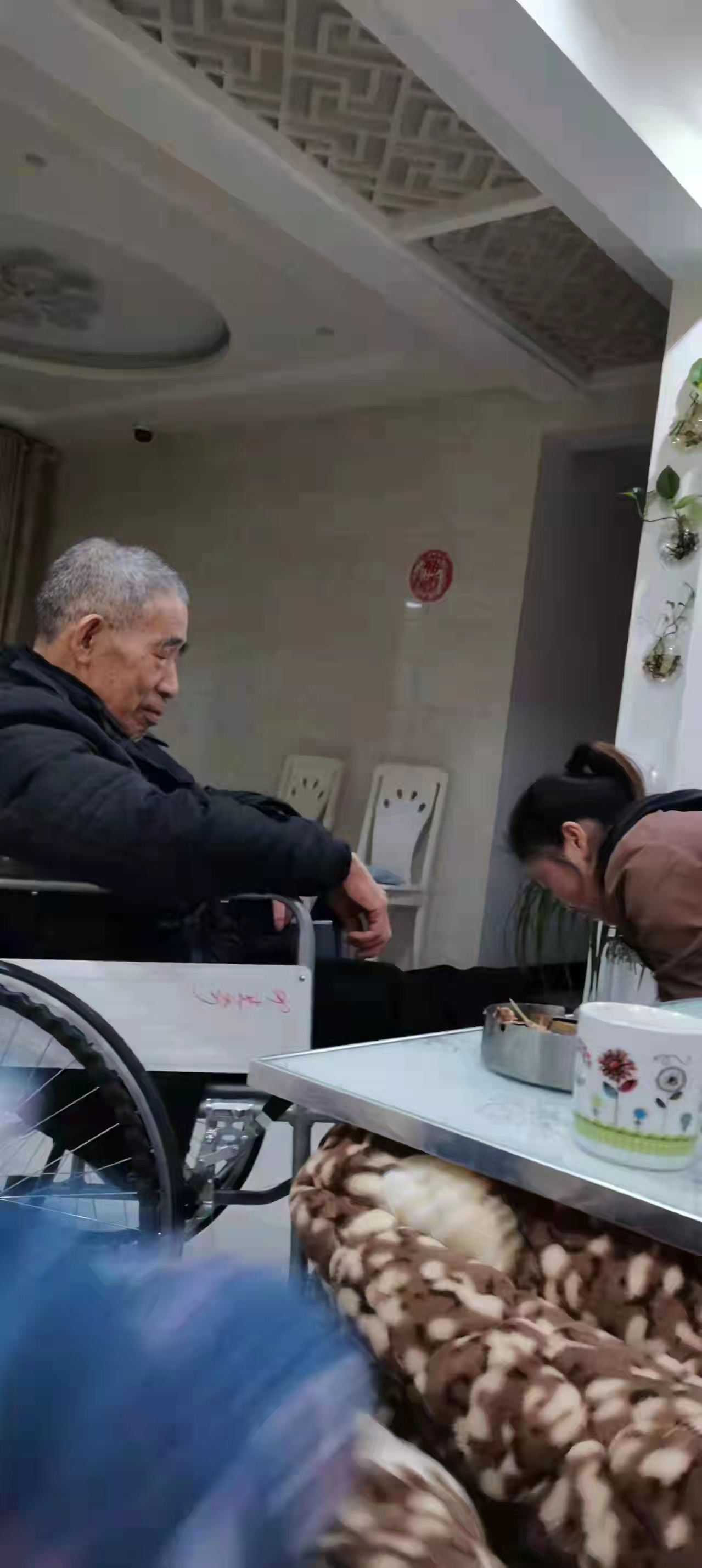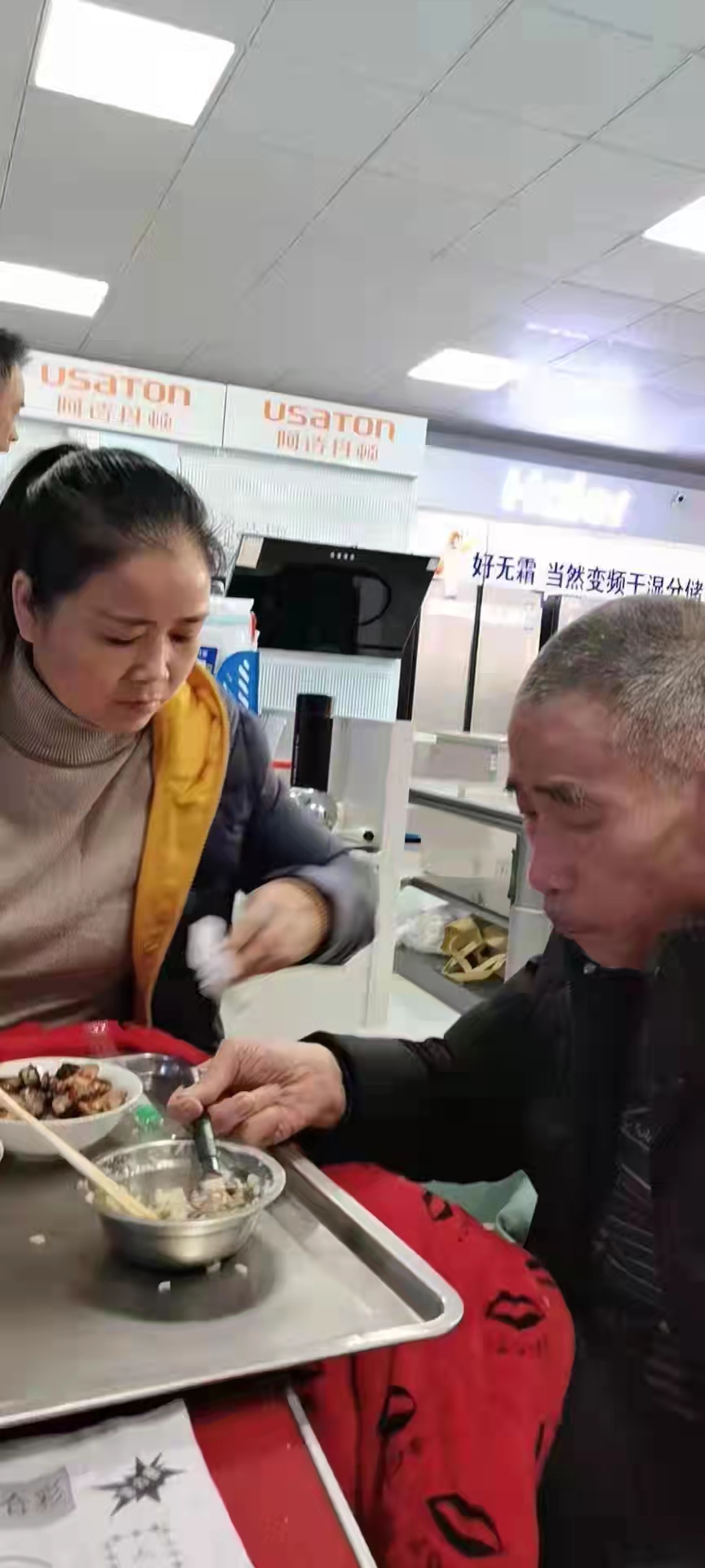 前些天有事经过他们的家电店,心想顺便去看看克爹。刚到店门口,只见心华双手吃力搀扶着克爹,克爹则用那还比较灵活,稍有点力的手扶着店内陈列着的一排的洗衣机,一步一步艰难地移动着。看着心华那娇小柔弱的身躯。艰难而吃力的样子。我赶忙上去帮忙。想替换心华。心华忙笑着说不用了。已这样站站走走坚持半小时了,该休息了,也怕老爷子吃不消。听她这么一说,我觉得也是,便对她说:“这康复确需循序渐进,不能操之过急”。便将轮椅拖过来让老爷子坐下休息。闲聊一会已是中午了。心华老公送货未回。夫妇虽然很忙,但考虑到老爷子的身体,怕外面的饭菜没营养,一直坚持自已每天早上亲手做好早点、中午饭菜和营养汤。老公回来再从家里送到店里吃。当时电话联系老公还要一个多钟才能回,心华便对我说,希望我多坐会,他去对面买点饭菜,怕老人肚子饿,于是便起身买了水煮蛋、一个汤和一钵饭过来,伺候着老人一口一口地吃,她笑着对我说,这两天好多了,老爸慢慢能自己吃饭了,前几天还要我一口一口的喂,照这样发展下去,我相信我爸能恢复到以前的样子。
