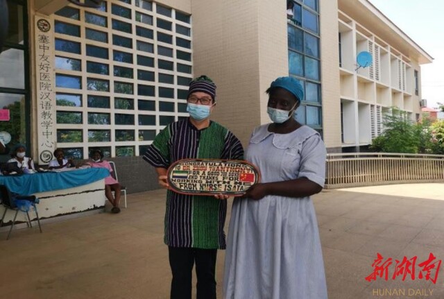 12月14日,第22批援塞拉利昂医疗队员、岳阳市中医医院针灸推拿科副主任医师周毅收到一份特殊的礼物。中塞友好医院的塞方同事给他赠送了一套塞拉利昂传统服饰和一个木雕的纪念牌。纪念牌上写着:“Congratulations to DR Zhou Yi for a good job done and thanks for working with me(祝贺周毅医生杰出的工作,并感谢你和我一起工作)”。岳阳市中医医院新任党委书记方奎明表示:周毅践行了“不畏艰苦、甘于奉献、救死扶伤、大爱无疆“”的中国援外医疗队的精神,将在全院号召大家学习周毅不断进取、精益求精,在异国他乡大力传播传统中华文化的精神。