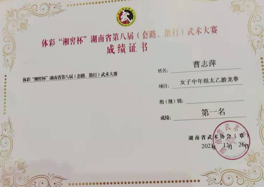 岳阳市健身太极拳运动训练中心由江玉良和方奎明两位省太极拳名师带领5名队员参加此项比赛。比赛中,队员们充分发挥敢打敢拼、坚持不懈的武术精神,最终万玲荣获女子中年组杨式太极拳第一名,曹志萍在女子中年组太乙游龙拳和女子中年组陈式太极拳中分获第一名第二名,杨丹荣获女子青年组陈式太极拳第二名,是全省120支代表队中取得成绩较好的队伍。