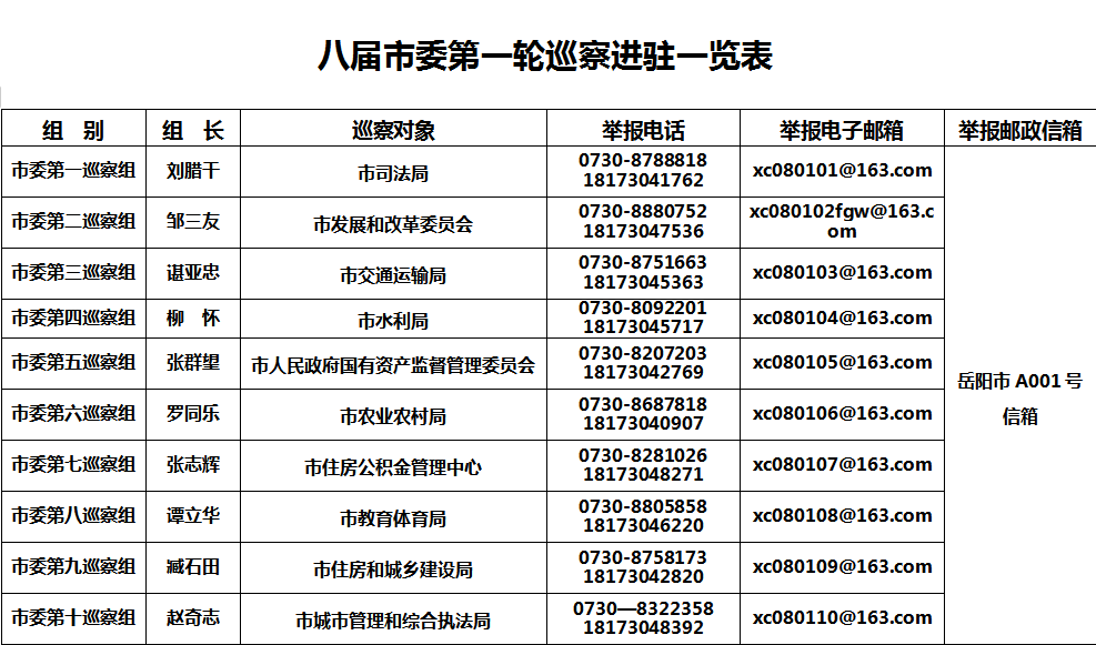 欢迎广大干部群众反映和举报与巡察有关的情况和问题线索。附:《八届市委第一轮巡察进驻一览表》