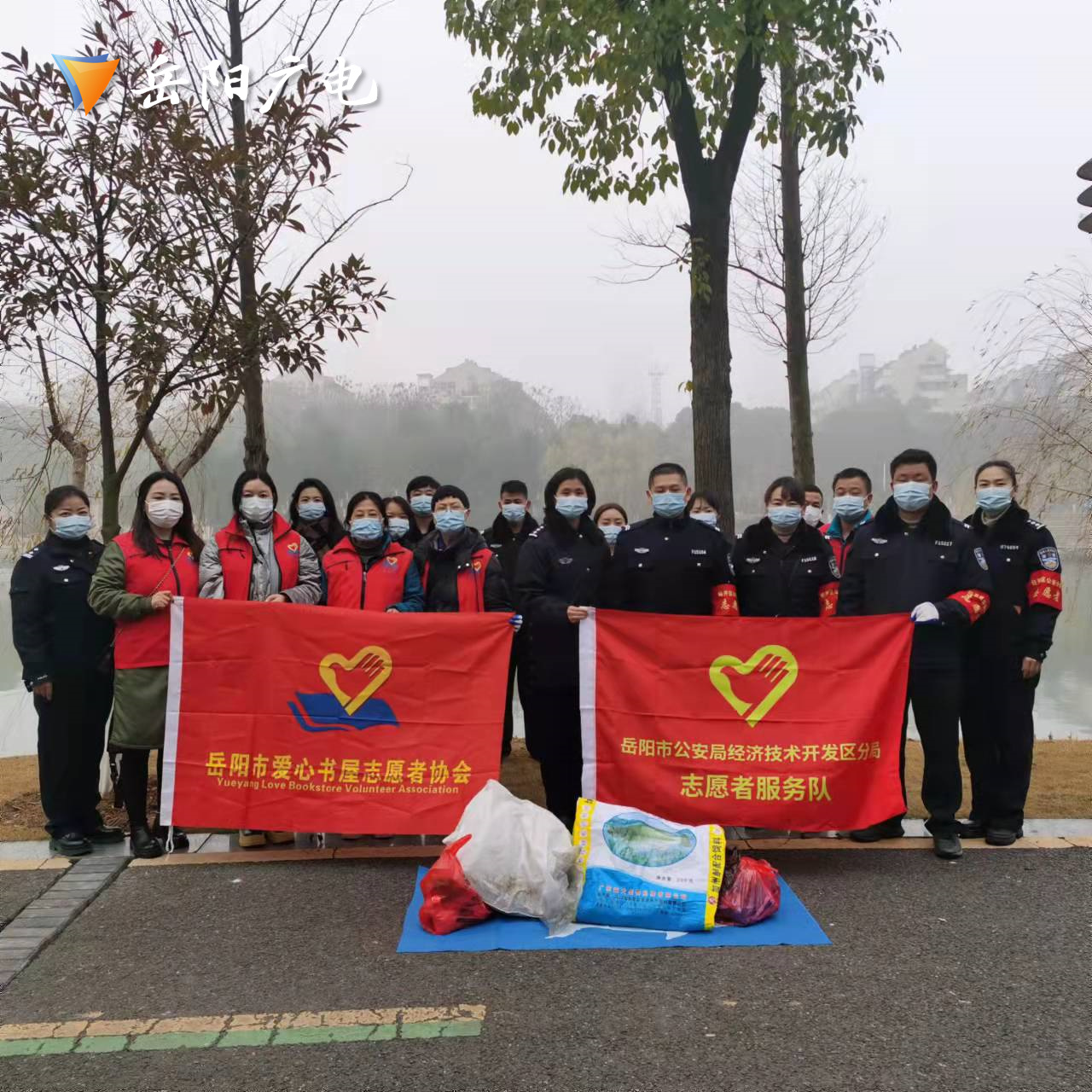 2022年元月11日,岳阳市爱心书屋志愿者协会联合市公安局经济技术开区公安分局志愿者队共20多人在岳阳市王家河公园水域进行文明劝导、巡湖、净滩等公益志愿服务活动。