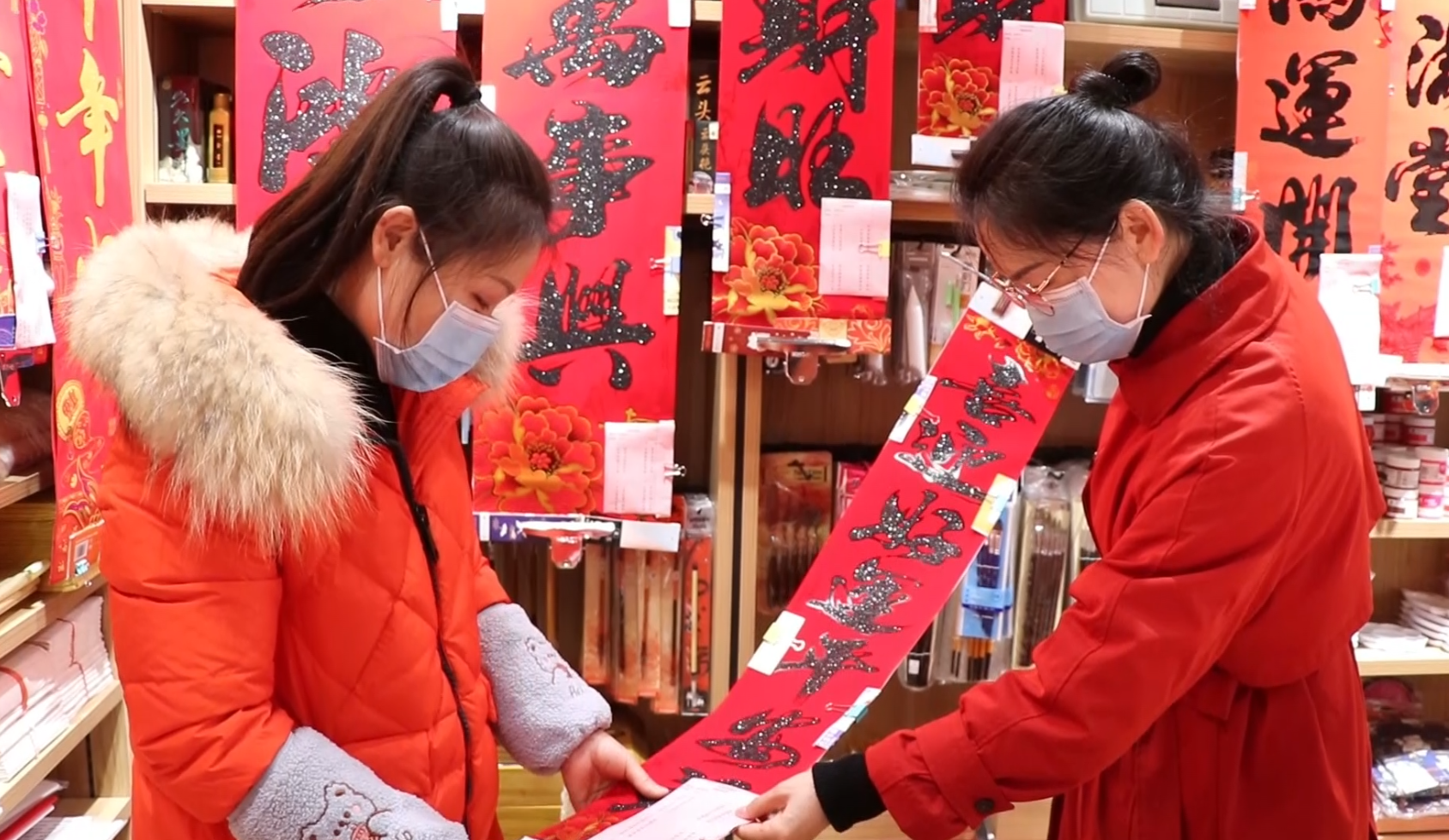 买“福”、买“旺”、买对联,为新年讨个彩头。据商店负责人介绍,“这几天来买福帖和对联的人很多,2022年绒布材质的对联,反面带自粘胶,贴起来很方便,特别受市民的欢迎。