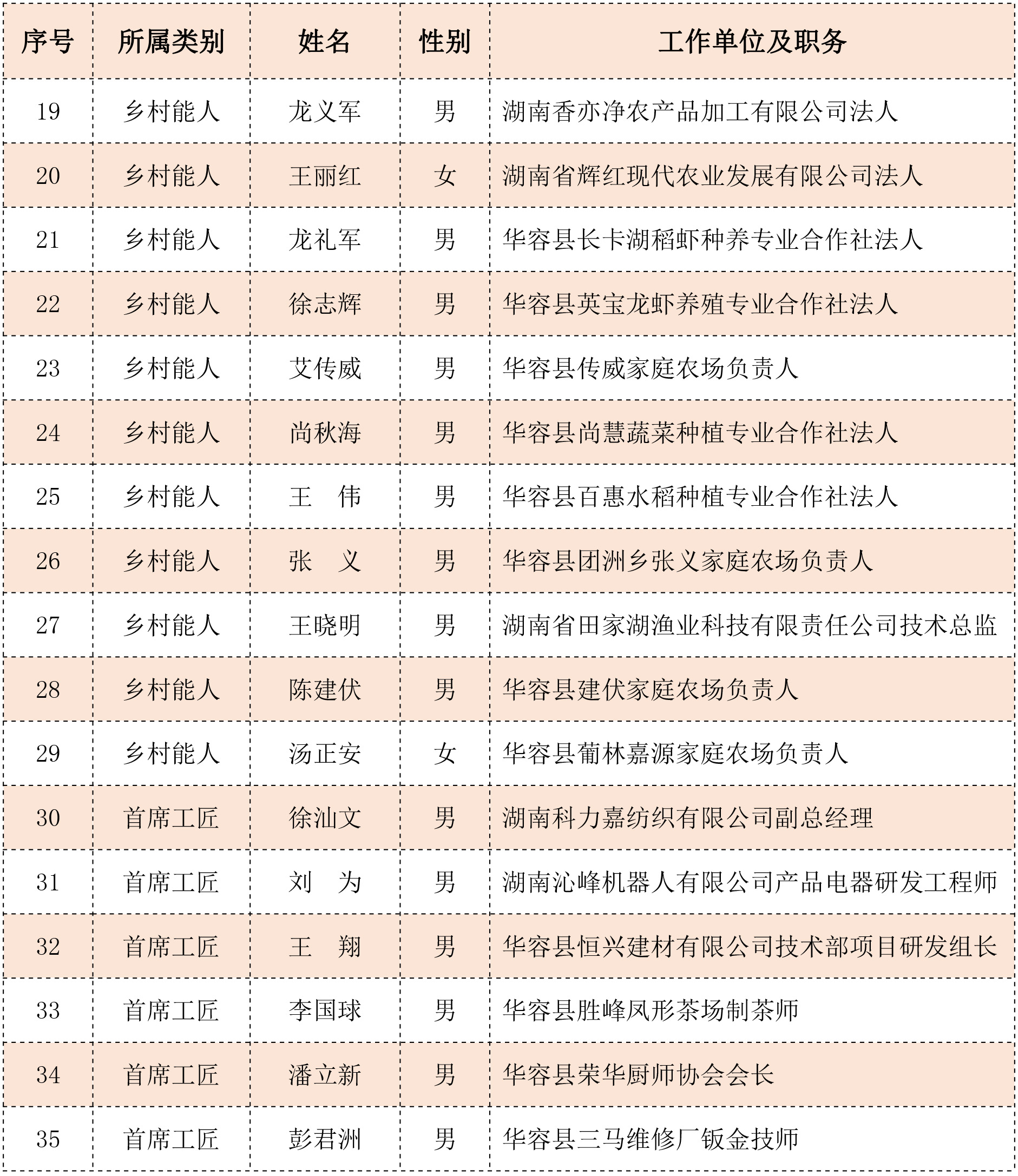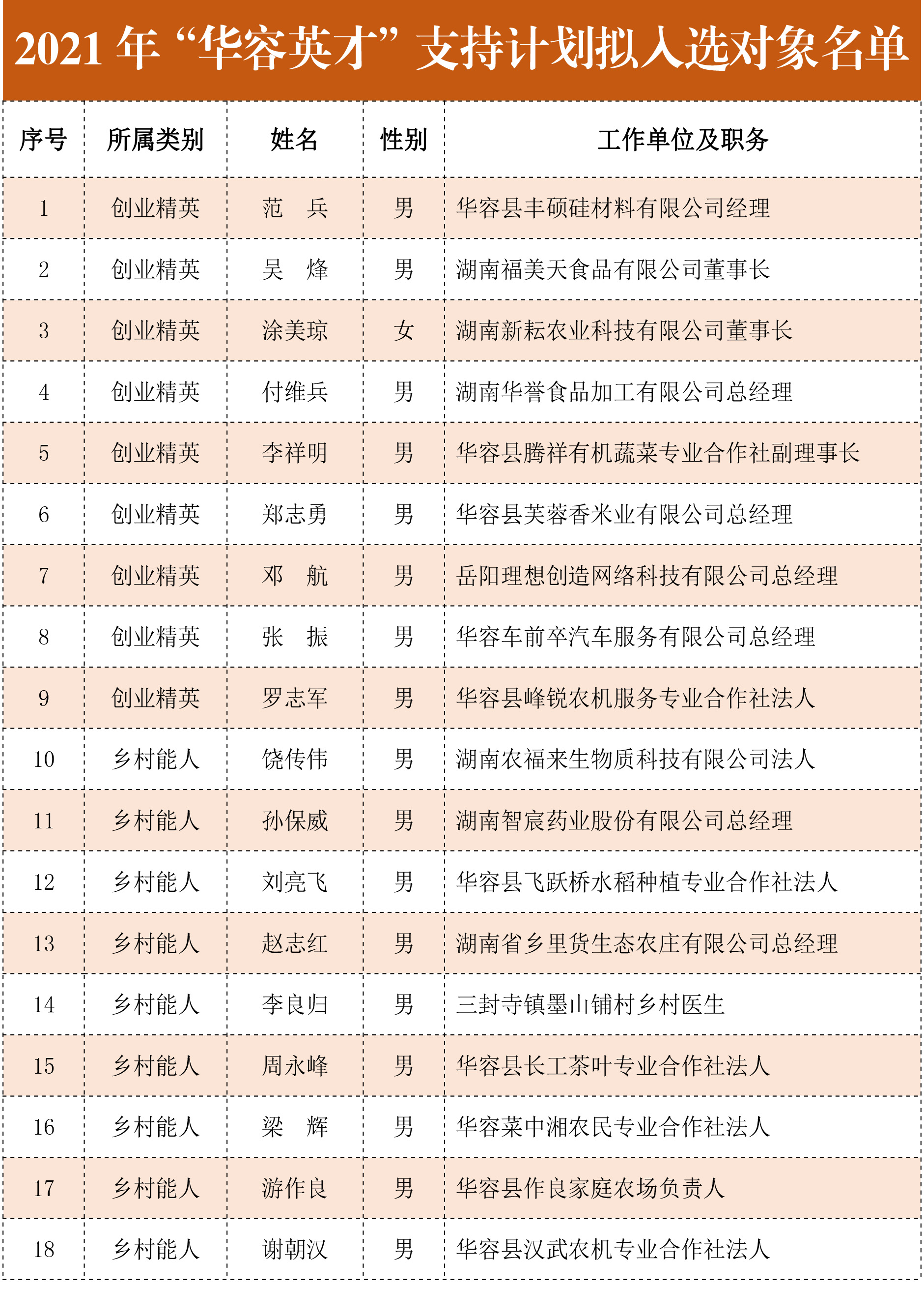 根据《华容县英才支持计划实施办法》和《关于开展2021年“华容英才·创业精英”选拔工作的通知》《关于开展2021年“华容英才·乡村能人”选拔工作的通知》《关于开展2021年“华容英才·首席工匠”选拔工作的通知》,经宣传发动、个人申报、单位推荐、部门联审,牵头单位初评、实地考察、专家评审等程序,报县委人才工作领导小组同意,拟定范兵等9名同志入选“华容英才·创业精英”支持计划,饶传伟等20名同志入选“华容英才·乡村能人”支持计划,徐汕文等6名同志入选“华容英才·首席工匠”支持计划,现予公示。如对拟入选对象有异议,请在公示期内以电话或书面等形式向县委人才办反映。