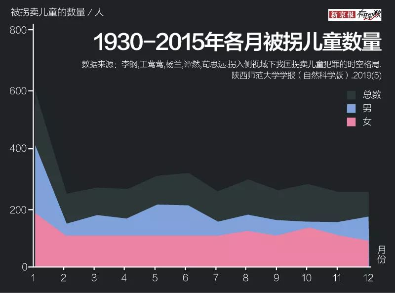 统计1930年到2015年的被拐卖儿童,记者发现,拐卖峰值出现在1月,其他月份波动较小,但无论哪个月被拐卖的男童都多于女童。