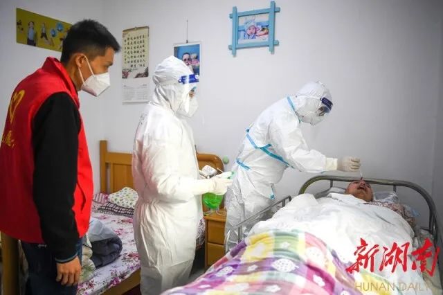 (3月25日,长沙市开福区秀峰街道秀峰山社区,志愿者来到行动不便的居民家中进行核酸采样。最近,该社区组织经过培训的医生、志愿者组成防疫突击队,为行动不便的老人和残疾人提供上门服务。湖南日报全媒体记者 傅聪 摄)