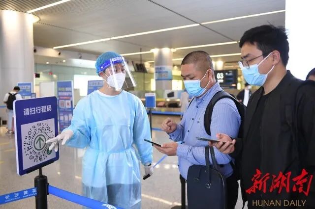 (长沙黄花国际机场国内到达出口,工作人员对旅客进行健康码、行程码检查。湖南日报全媒体记者 辜鹏博 摄)
