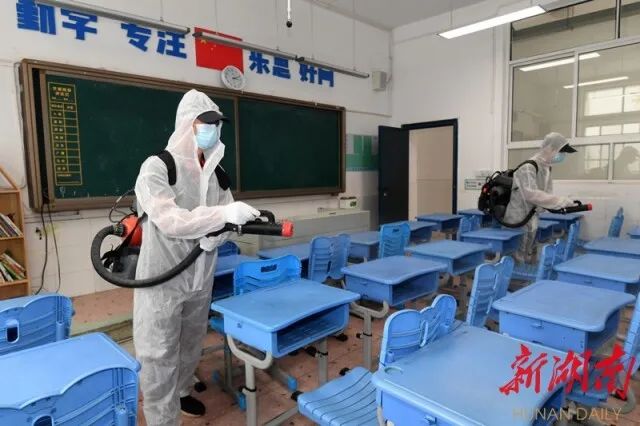 (长沙市开福区清水塘第二小学,专业消杀人员在对教室进行防疫消杀。湖南日报·新湖南客户端记者 田超 摄)