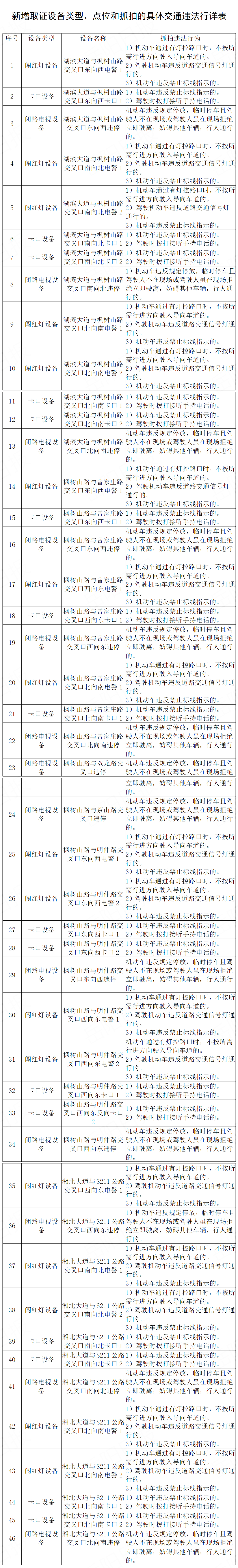 为进一步推动城市交通综合整治,规范道路交通秩序,提升城市管理水平,依据《中华人民共和国道路交通安全法》《湖南省实施<中华人民共和国道路交通安全法>办法》等法律法规规定,决定在市城区增设一批道路交通违法取证设备。现将新增的道路交通违法取证设备类型、点位和抓拍的具体交通违法行为予以通告,自2022年4月5日起施行。