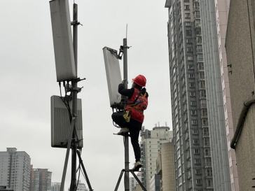 图为移动技术人员调整隔离区域基站天线设备