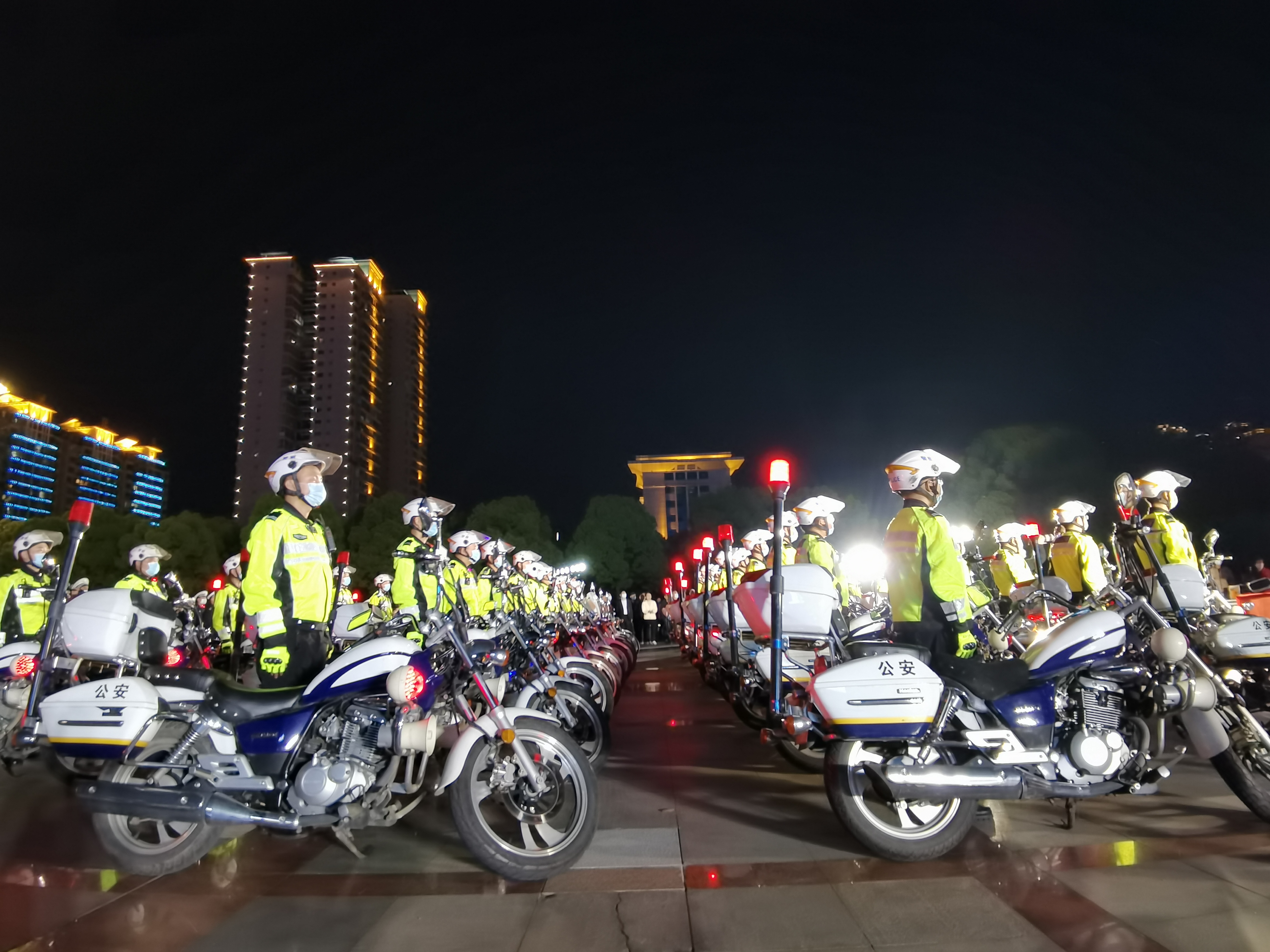 誓师大会现场,200名民辅警队伍组成的方队整齐划一、英姿勃发,40辆摩托车组成的骑警方队斗志昂扬、蓄势待发,6辆警车组成的警车方队的电子屏显示主题鲜明夺目、扮靓整个广场。