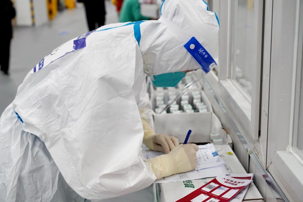 4月30日,上海临港方舱医院的医护人员在整理感染者信息。新华社记者杨有宗 摄