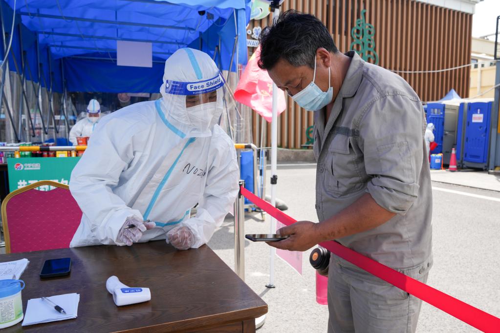 4月22日,在沪宁高速黄栗墅服务区,工作人员在查验一位货车司机的健康码。新华社记者李博 摄