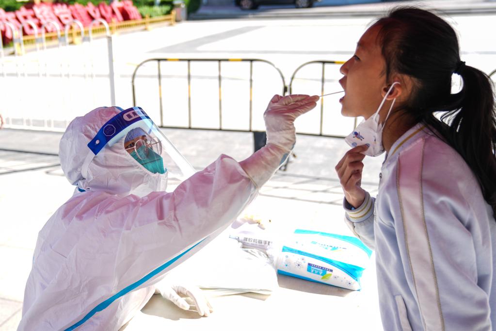 4月30日,北京市大兴区亦庄镇一核酸采样点,医护人员为市民进行核酸采样。新华社记者彭子洋 摄