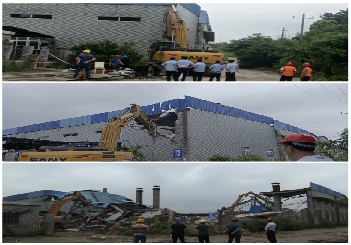 岳阳广电全媒体讯(通讯员:付平、汪维)为全面落实违法建设常态化治理工作,切实消除房屋安全隐患,确保人民群众生命财产安全,岳阳县县委县政府始终坚持高位推进。6月2日,岳阳县人民政府组织县人民法院、县公安局、县自然资源局、麻塘办事处等部门,对麻塘办事处金垅村弘泰瓷业有限公司存在重大安全隐患生产车间、办公楼、住宿楼、临时搭建违规棚亭等13处违法建设进行依法拆除,拆除面积15743.95平方米。