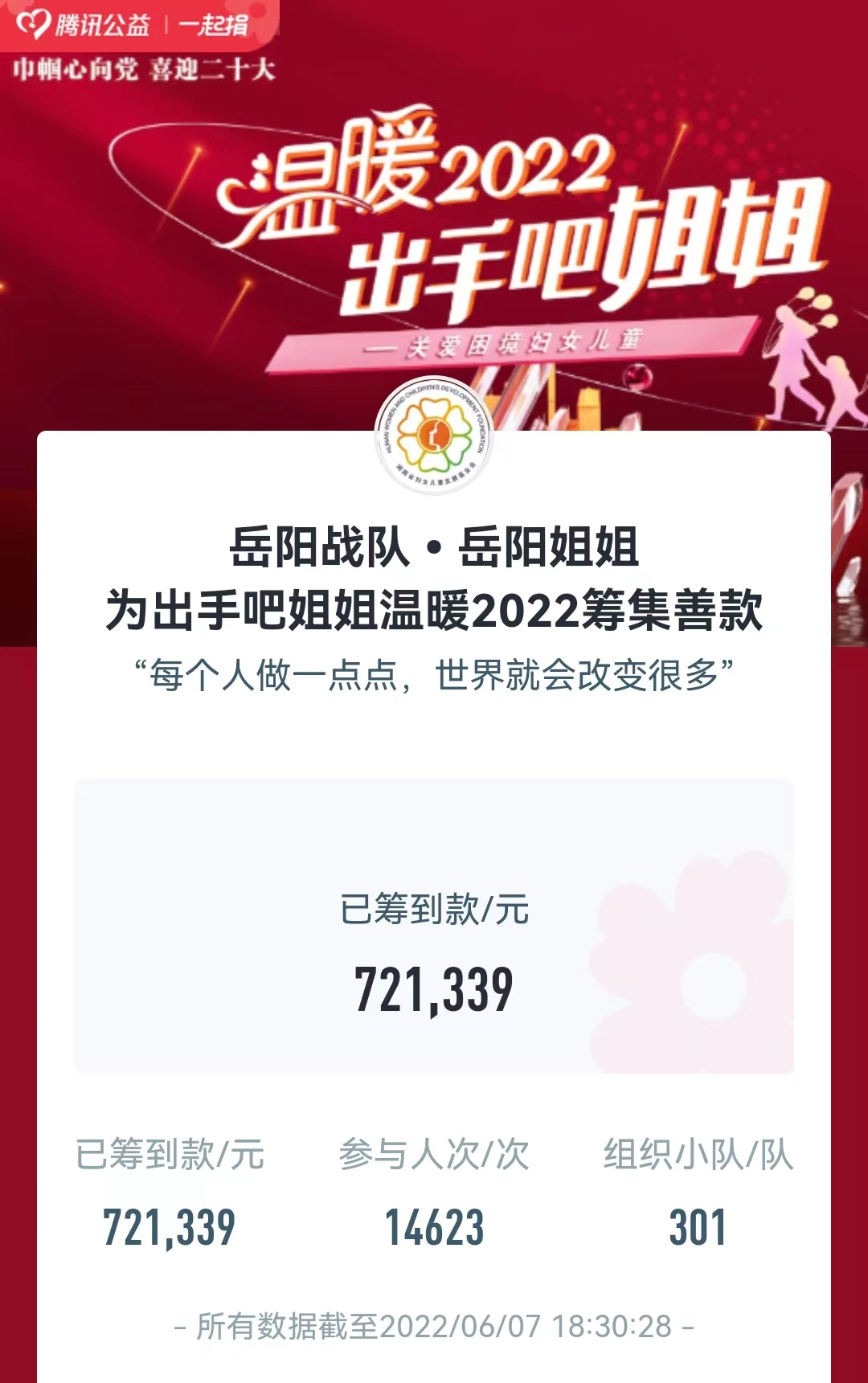 岳阳广电全媒体讯(特约记者 刘小平)截止6月7日晚,短短一周时间,岳阳战队·岳阳姐姐为“出手吧姐姐 温暖2022——关爱困境妇女儿童”项目筹集善款72万余元,组建301个小队,14000多人次出手捐助。1万多笔捐款,如同1万多股暖流,汇聚成温暖力量,在岳阳大地奔涌流淌。