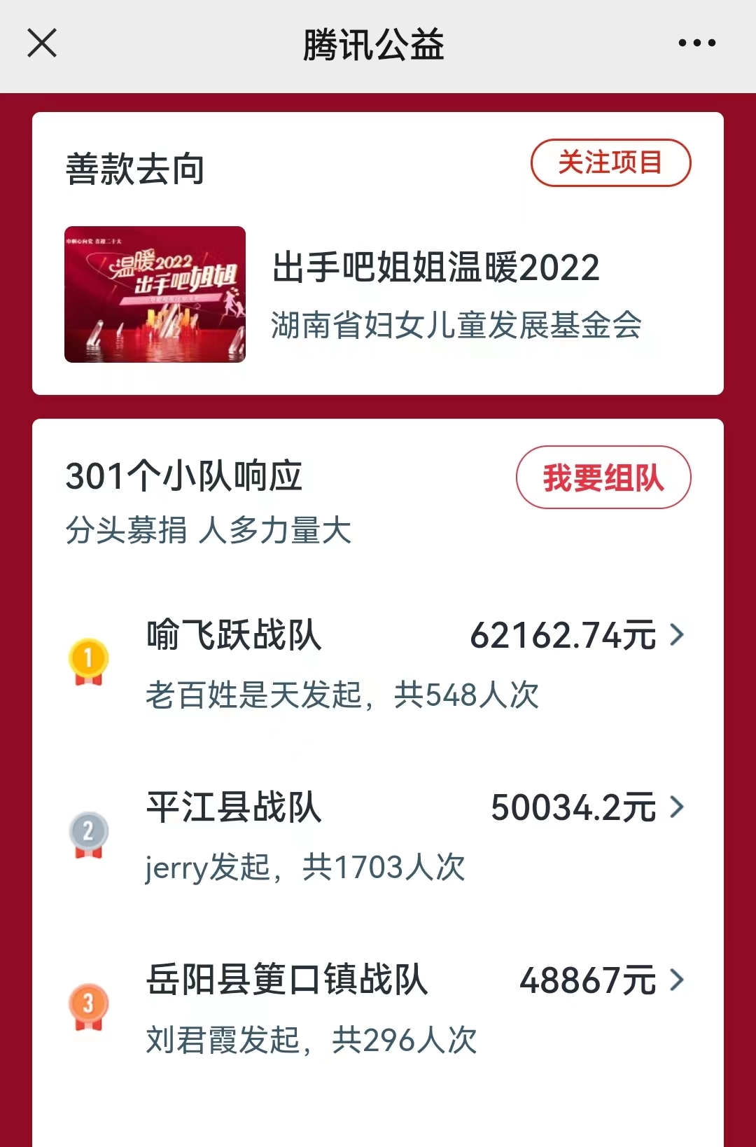 “来吧!我已组建喻飞跃战队,邀请您加入一起做公益!欢迎大家伸出您充满爱心之手奉献大爱,同时转发我们的捐款链接,让更多的爱汇聚,让困境中的家庭感受到大爱的温暖!”岳阳市妇联党组书记、主席喻飞跃组建实名战队,在朋友圈持续推送消息为活动拉人气。领导同事朋友深受感染积极参与,谱写爱的篇章,目前战队成绩一直稳居第一。