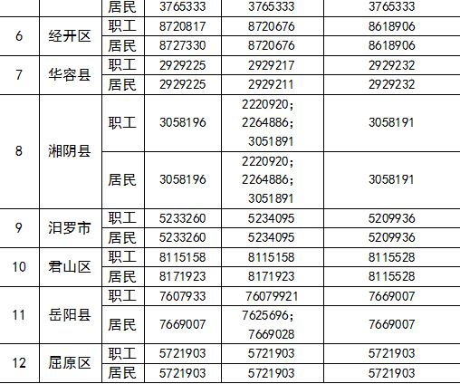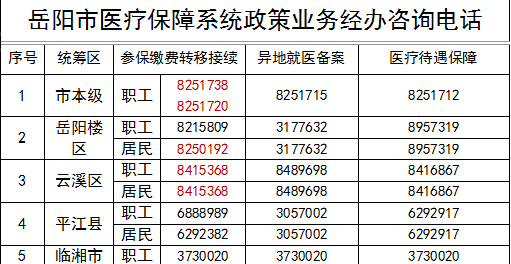 2.拨打各级医疗保障部门公开服务电话咨询。岳阳市本级及各区县医保参保管理、异地就医备案、医疗待遇保障咨询电话如下,请注意收藏保存: