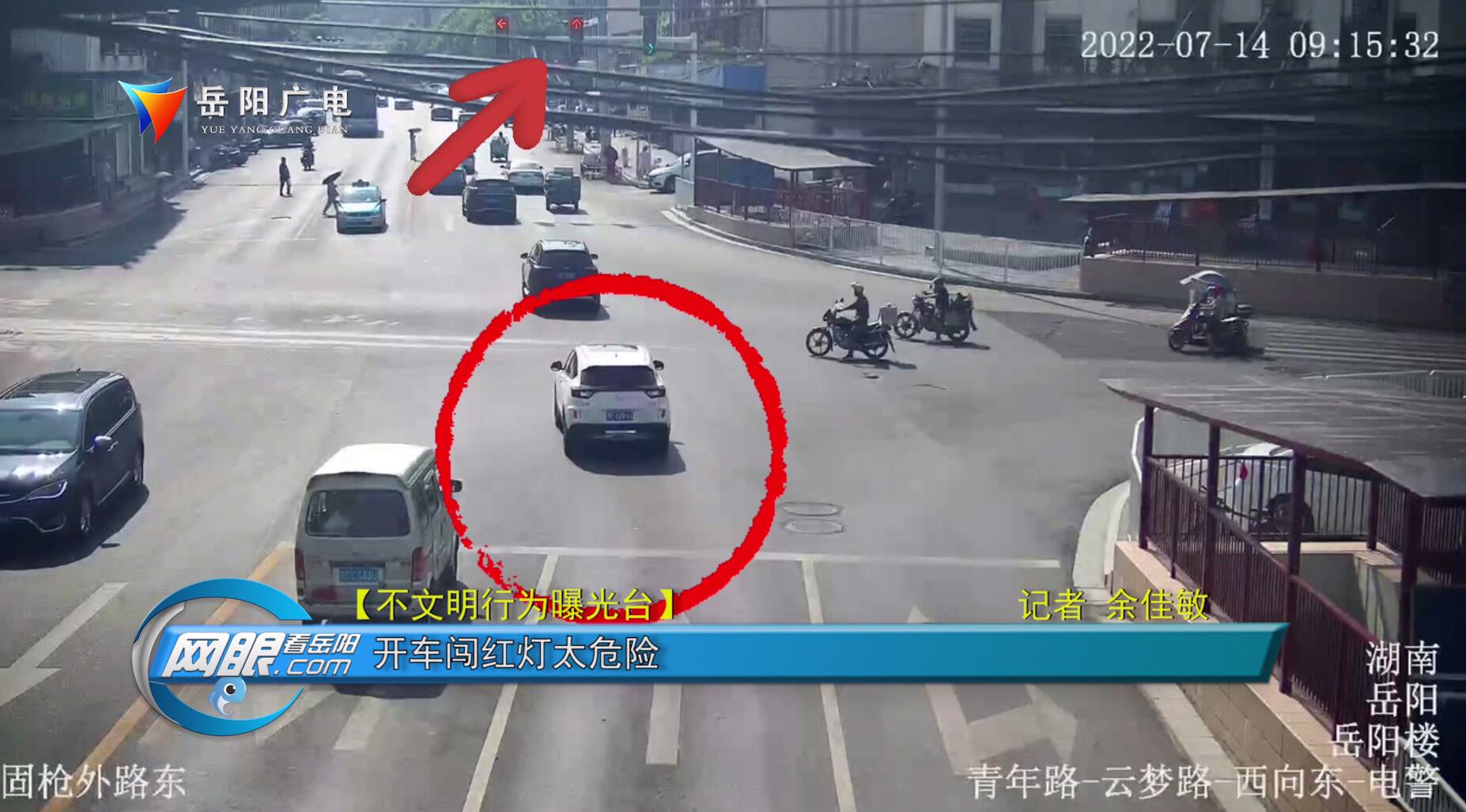 7月14日,上午9点15分,在岳阳楼青年路与云梦路十字路口红灯时,由北往南方向,一辆白色越野车未停下,直接闯红灯通行。
