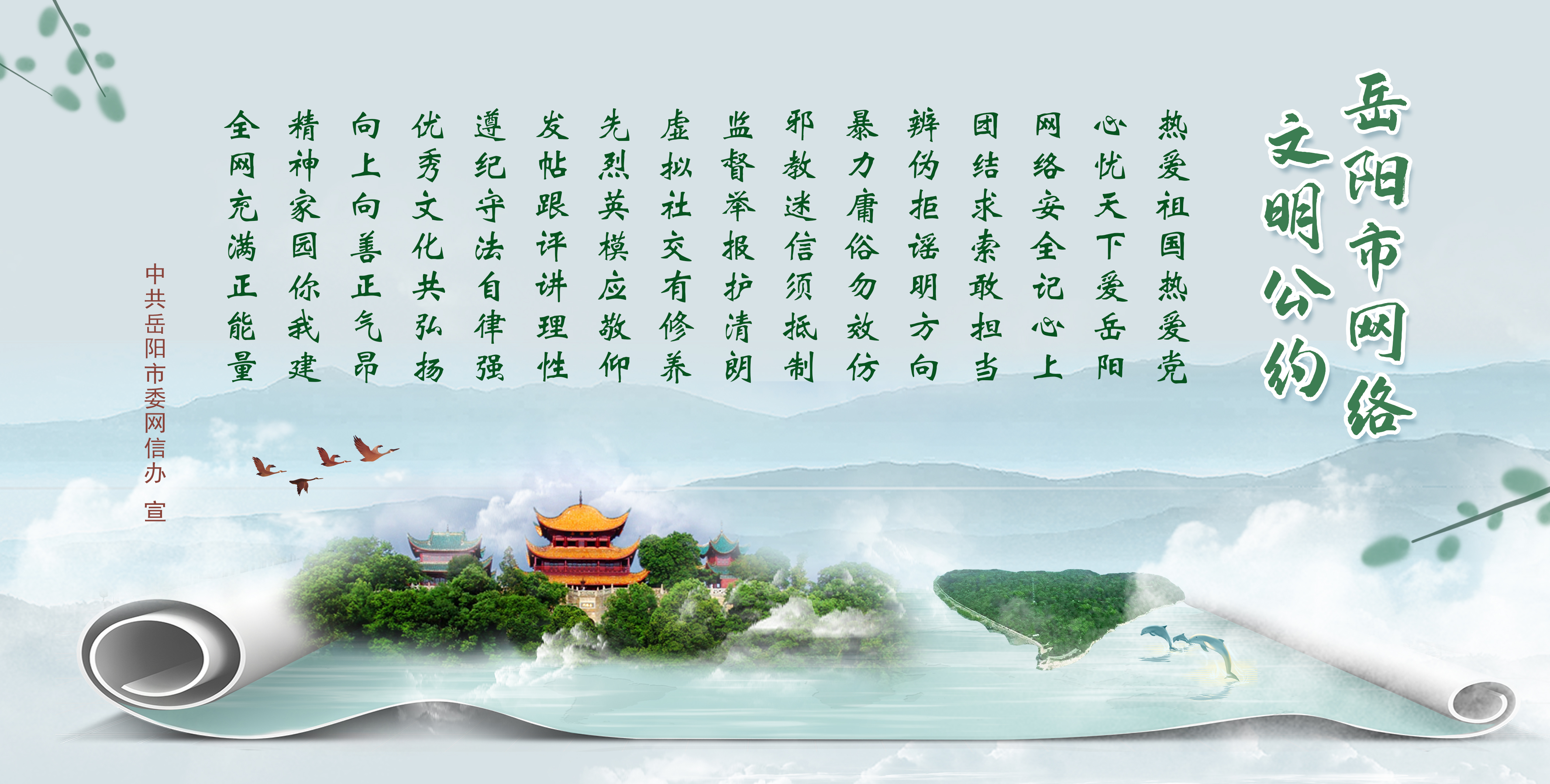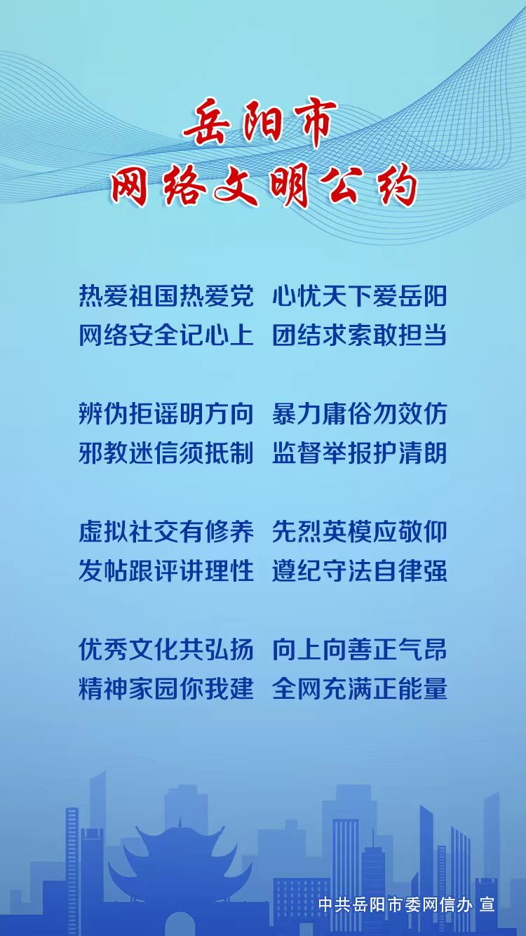 经过全网征集、专家评审、征求意见、集体审定等环节,《岳阳市网络文明公约》已正式面向全网发布,这是湖南省市州推出的首部网络文明公约。