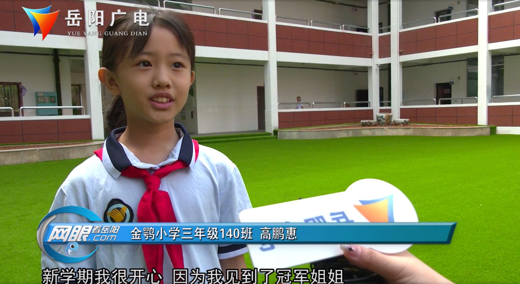 金鹗小学三年级140班 高鹏惠:新学期我很开心,因为我见到了冠军姐姐,而且学校的颜色也变了,变成了红色,非常好看。