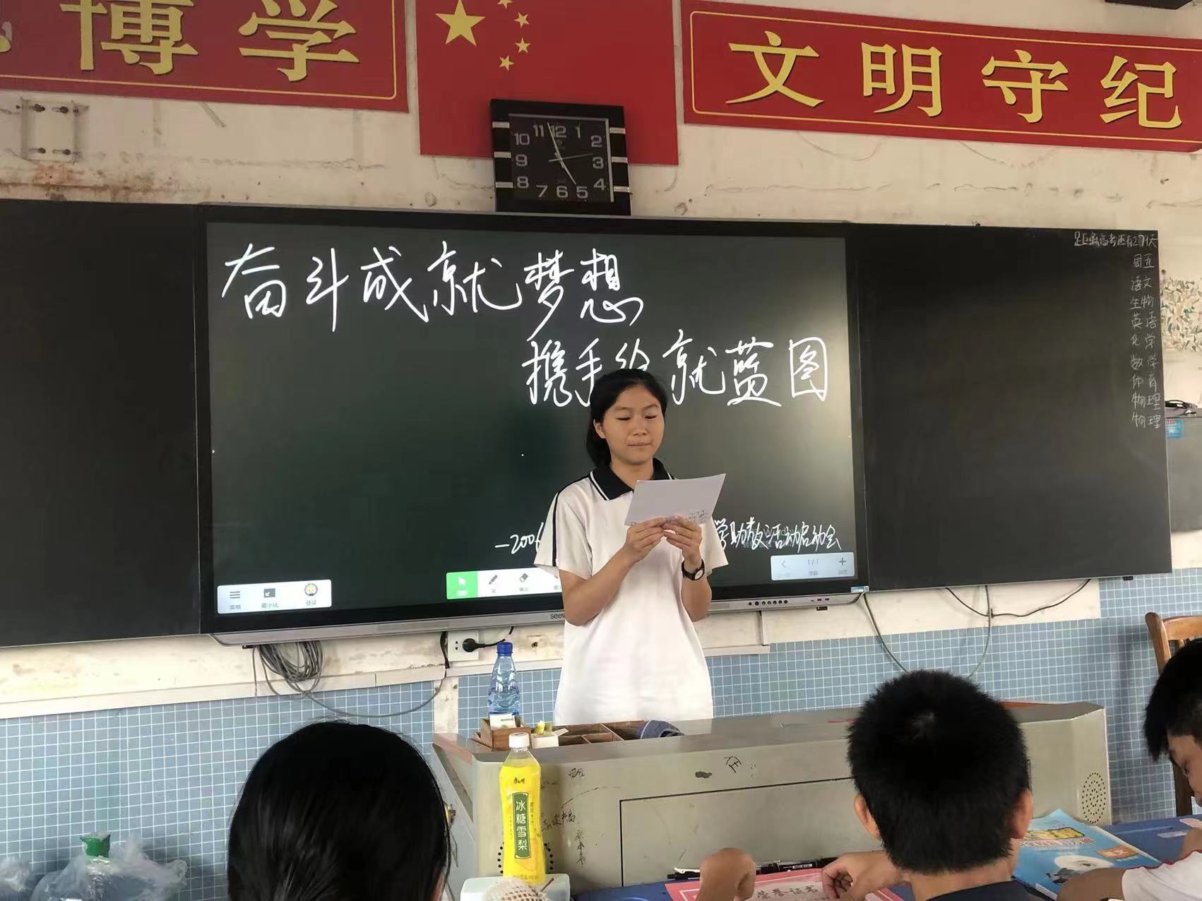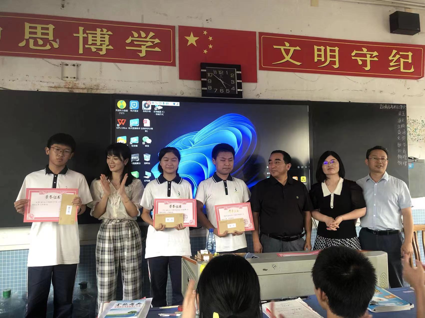 班会课上,校友代表对上次考试中取得优异成绩的学生进行了奖励。“独在异乡为异客,每逢佳节倍思亲。”中秋佳节临近,远在杭州工作的校友周麒寄来了亲手录制的视频,委托校友播放,分享了自己当年努力拼搏考入浙江大学的学习体会,当年他参加高考,英语成绩从平时的75分提高到110分,他鼓励大家“踏实上好每一节课,重视每一个知识点”。