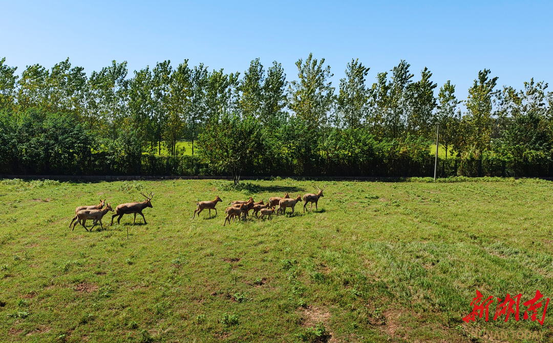 2021年9月24日,一群麋鹿在东洞庭湖麋鹿和鸟类救助避难中心里奔跑。湖南日报全媒体记者 辜鹏博 摄