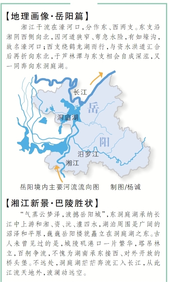 登楼远眺,往南,是“白银盘里一青螺”的君山岛;往北,是江湖交汇的三江口。