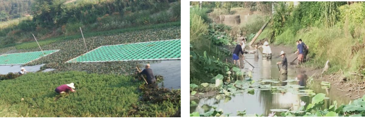 大乘港全长1711米,是禹山镇受生活面源影响最严重的一条河流,2021年禹山镇对大乘港进行了一系列的生态修复和污染源治理,水体水质明显提升。为有效防范破坏生态环境,南竹村放弃使用投入少、作业面大、效率高的水陆挖机,选择用投入大、时间长、效率低的人工疏挖,达到疏通引水和保护生态环境的效果。