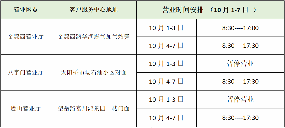 岳阳华润燃气有限公司客户服务中心国庆节期间营业时间调整安排如下: