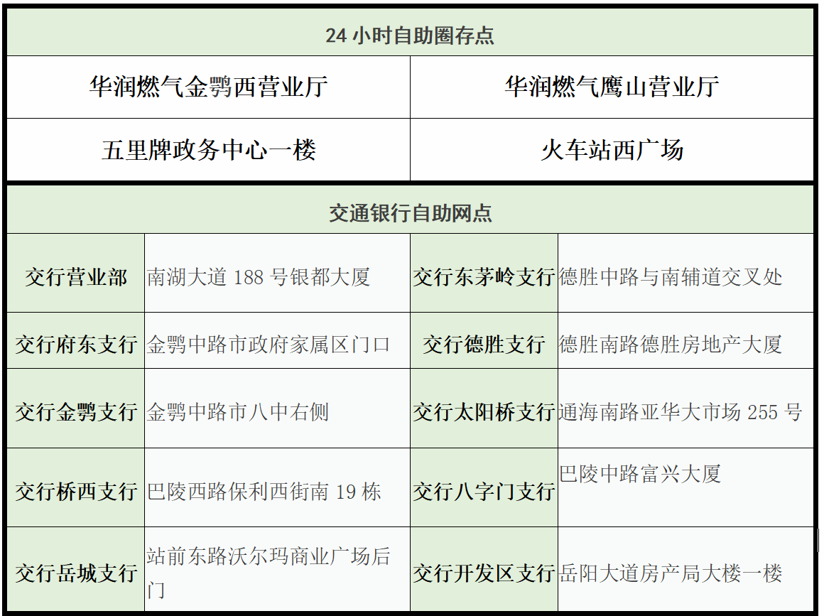 为了全市人民节日期间购气便捷,岳阳华润燃气有限公司已开通交行自助缴费代缴服务,燃气用户可前往24小时自助点缴费圈存,或持银联卡前往交通银行自助网点缴纳燃气费。