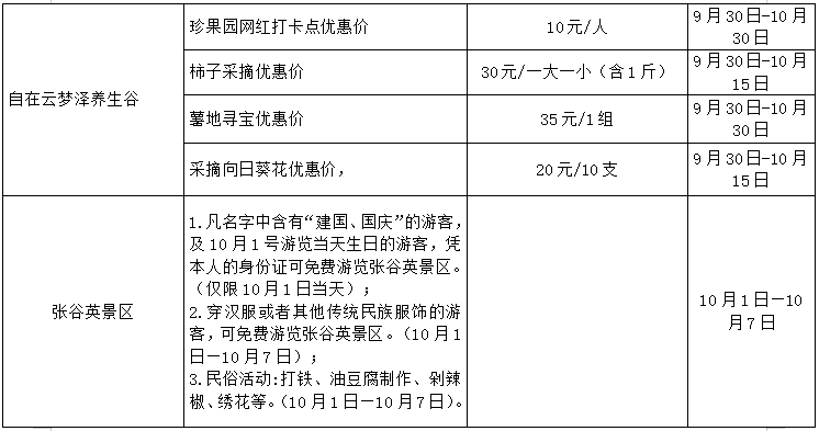 1、凡名字中含有“建国、国庆”的游客,及10月1号游览当天生日的游客,凭本人的身份证可免费游览张谷英景区。(仅限10月1日当天);