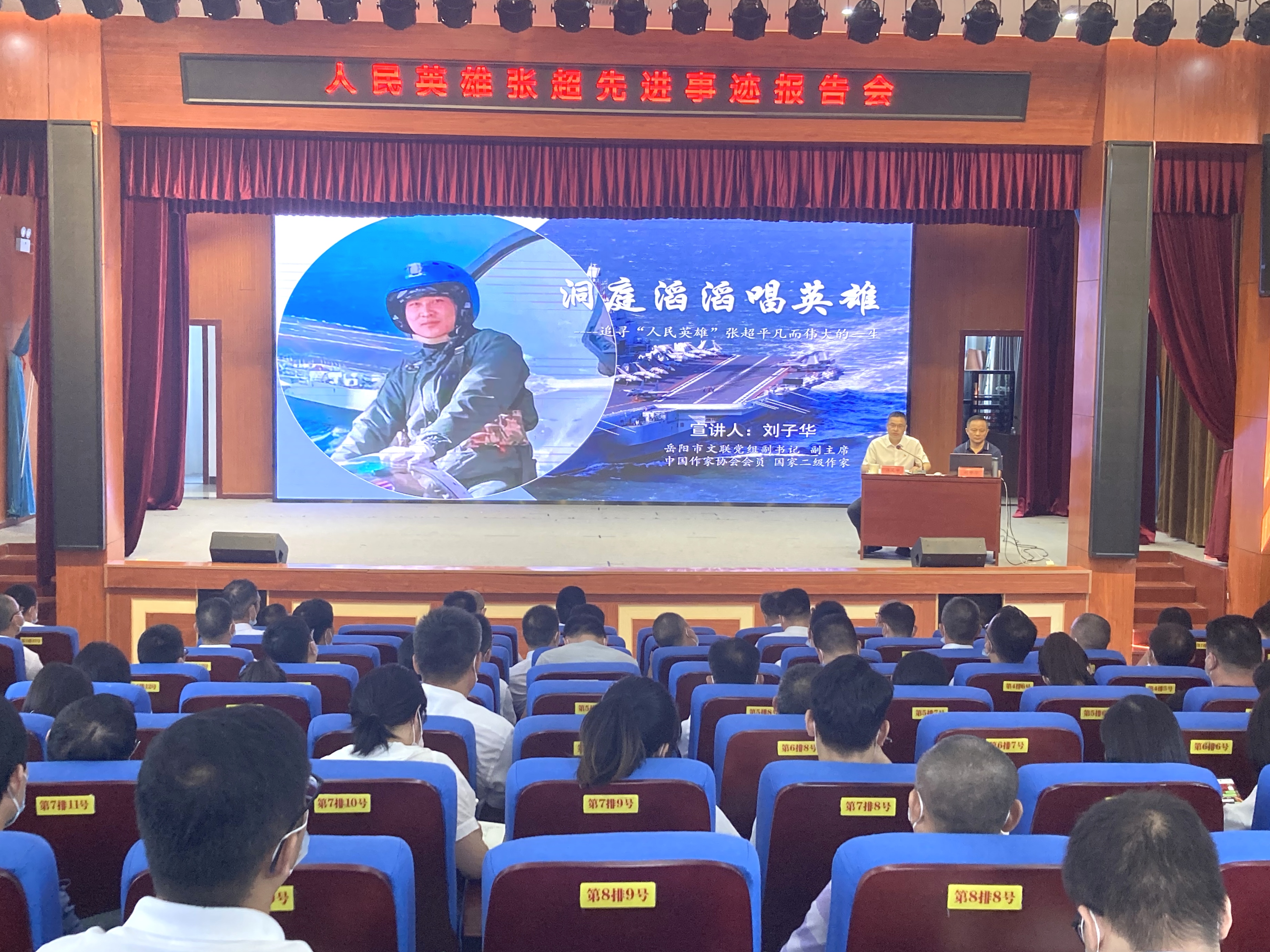 刘子华是中国作家协会会员,结合自己近3年来采访、写作长篇报告文学《逐梦海天—记人民英雄张超》的实际,用视频、音频、图片等方式精心制作了课件。在近两个小时的宣讲中,刘子华用鲜活的故事,感人的细节,为大家还原了一个血肉丰满、可信可敬的人民英雄形象。张超为国捐躯,树立了圣洁的精神坐标,刘子华概括为理想崇高、爱党爱国、向海图强、英勇无畏、勤奋执着、崇德向善。