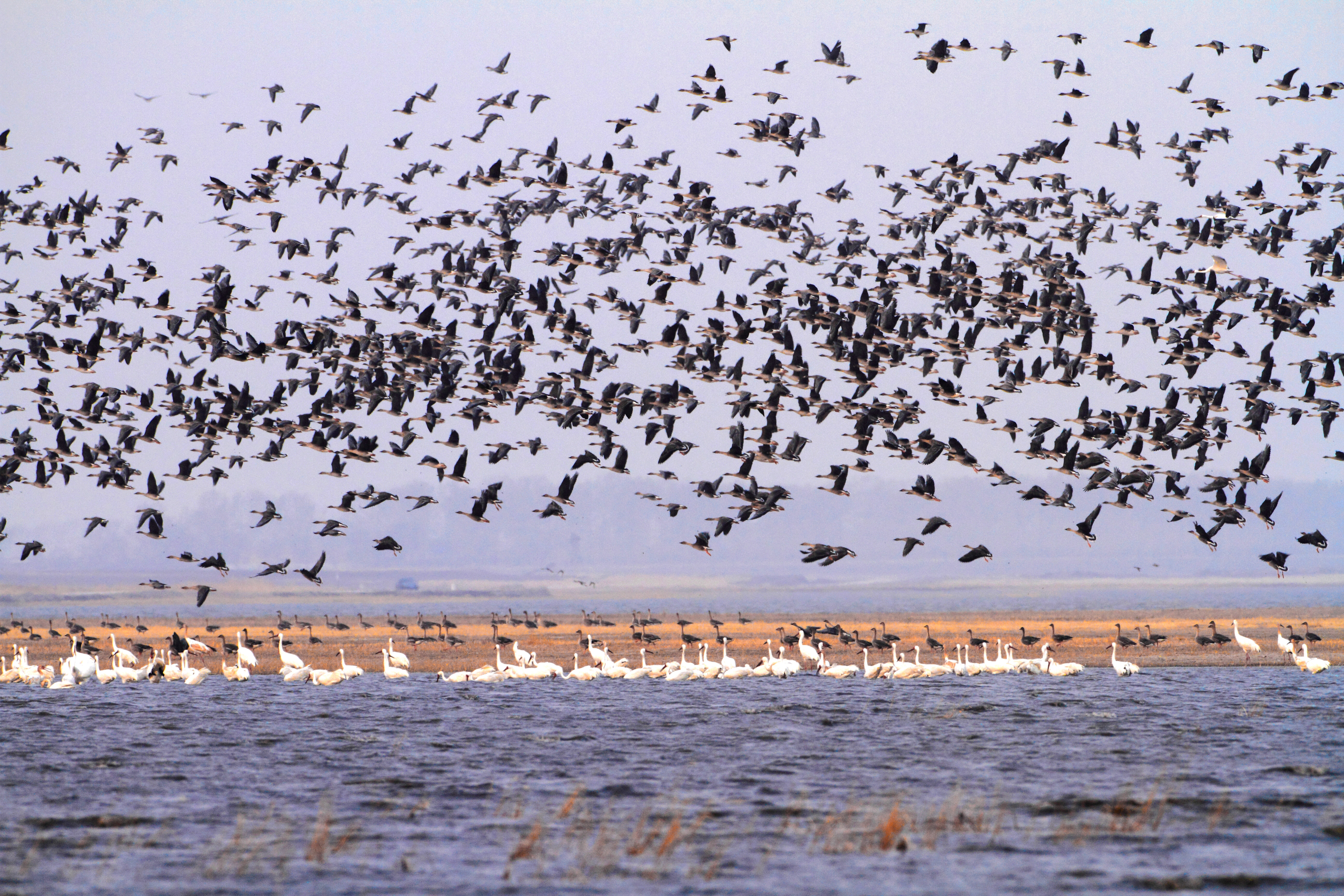 数据显示,洞庭湖区域有维管束植物873种、脊椎动物531种,其中鸟类361种,占全国种数三分之一,越冬候鸟近年每年增长两万余只,达29.8万只,珍稀濒危动物麋鹿、黑鹳、东方白鹳等数量明显增加,江豚、白鹤、青头潜鸭等频繁现身。
