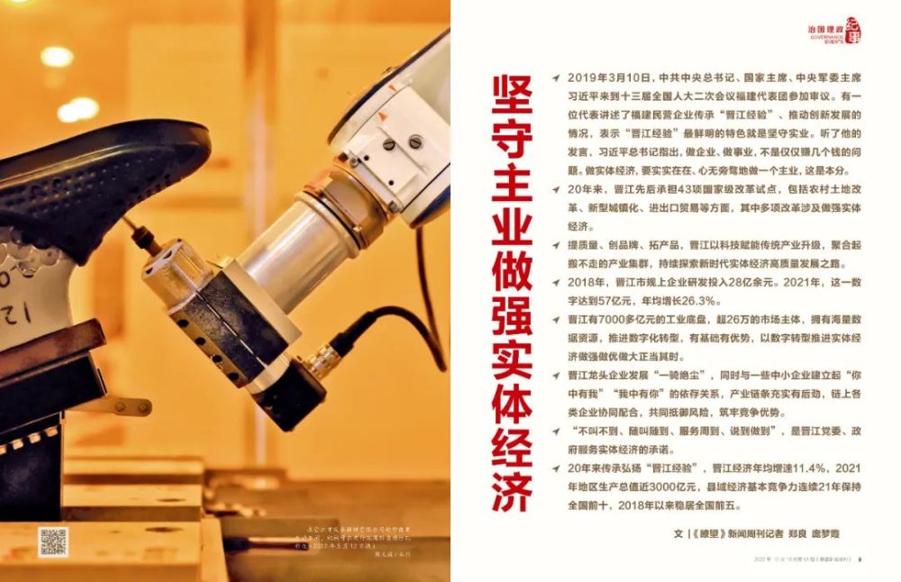 20年来传承弘扬“晋江经验”,晋江经济年均增速11.4%,2021年地区生产总值近3000亿元,县域经济基本竞争力连续21年保持全国前十,2018年以来稳居全国前五。