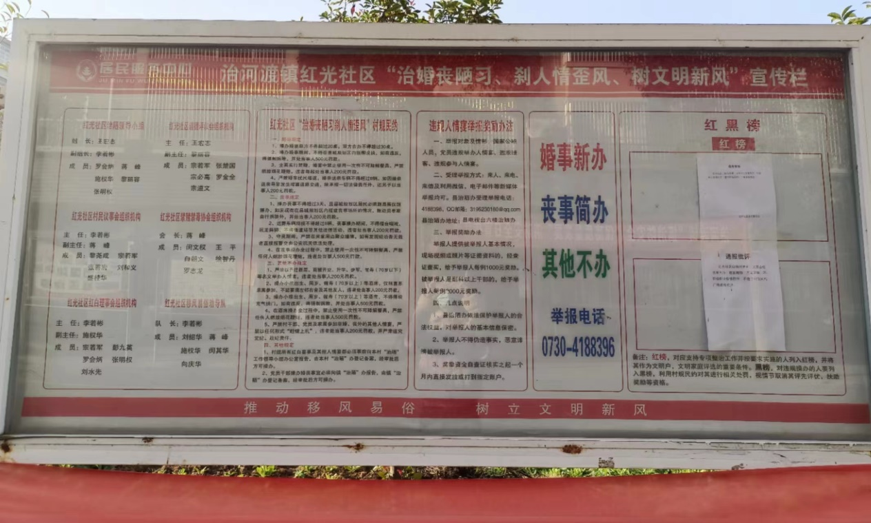 今年以来,红光社区以家风清廉为重点,将本土清廉价值观融入村规民约、基层治理,积极推广治陋习树新风“红黑榜”,通过正面树立移风易俗先进事例典型,反面曝光大办宴席、违反治陋规定等行为,带动全社区居民遵规守约,进一步提高婚丧嫁娶节约节俭意识,培育清廉新风尚,不断推进文明新风走深走实。