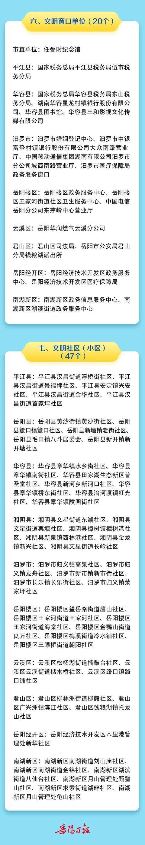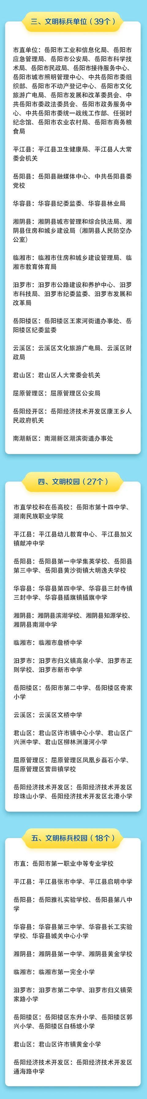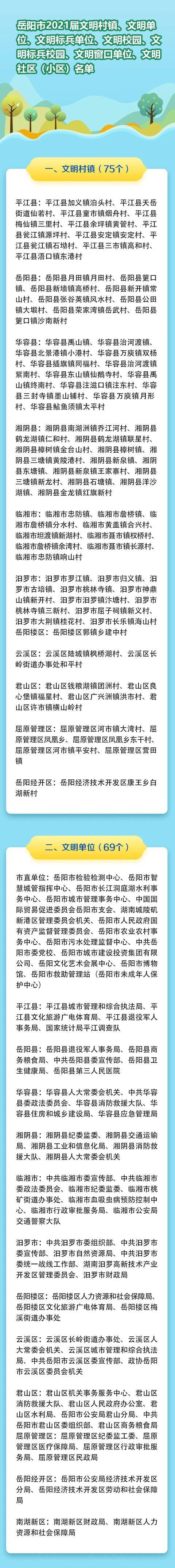 5月24日,岳阳市文明办发布《岳阳市2021届文明村镇、文明单位、文明标兵单位、文明校园、文明标兵校园、文明窗口单位、文明社区(小区)公示公告》根据市文明委工作安排,通过各地各部门逐级推荐、层层审核、征求意见,市文明办严格审核、从严把关,经2022年市文明委全会审议,现将名单予以公示。