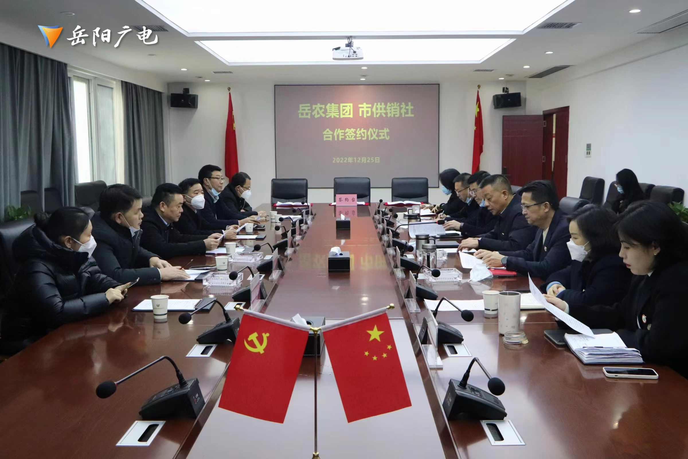 12月25日上午,市供销合作联社与岳阳市农业农村发展集团有限公司举行签约仪式开展战略合作。合作协议具体由岳阳供销电子商务有限公司、岳阳市惠农供销农业服务有限公司、岳阳市农业农村发展集团聚农贸易有限公司三家公司签订,共同组建合资公司开展业务。市供销社党委书记、理事会主任彭岳武,市供销社党委副书记、监事会主任向风行,市社领导刘文恕、邹变龙、周傲文,市农发集团党委书记、董事长邹国良,市农发集团党委副书记、总经理刘铁壮出席签约仪式。市供销社相关科室责任人,市农发集团下属相关企业负责人、部门负责人参加签约仪式。