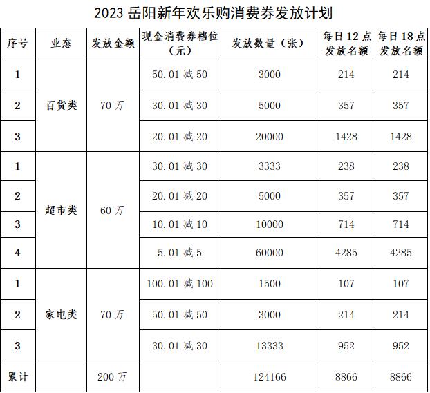 2023年1月13日(腊月廿二,星期五)至2023年2月19日(正月廿八,星期四)云闪付APP将为岳阳市民发放消费劵。消费券拟分7期发放:发放时间为1月15日至1月21日每天上午12:00时,下午的18:00时两档发放。每期消费券领完即止,将根据核销情况适时调整。具体安排如下:
