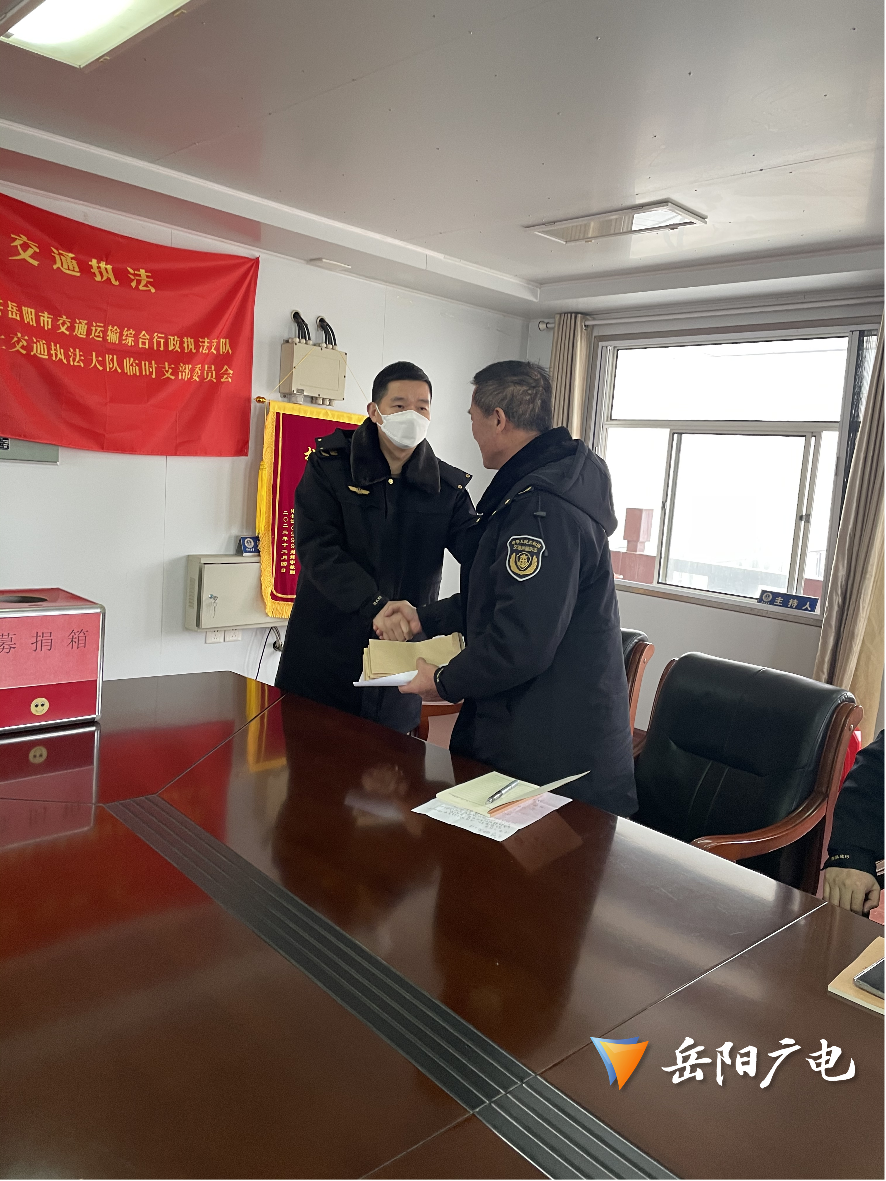 1月13日上午10时,岳阳市交通运输综合行政执法支队海事行政执法大队会议室暖意浓浓,海事行政执法大队大队长罗敏组织干部职工为黄益同志爱心捐款,捐款活动累计募集善款30人次,合计31300元,罗敏大队长将爱心善款交到黄益同志的手中。