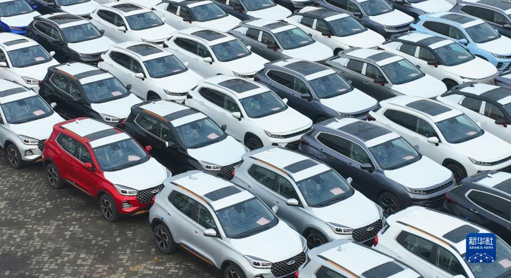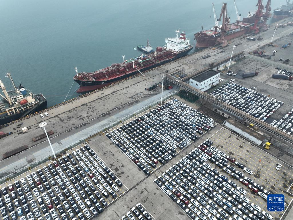 1月13日,在江苏连云港港口码头,一批国产小汽车在等待装船出口海外(无人机照片)。新华社发(耿玉和 摄)