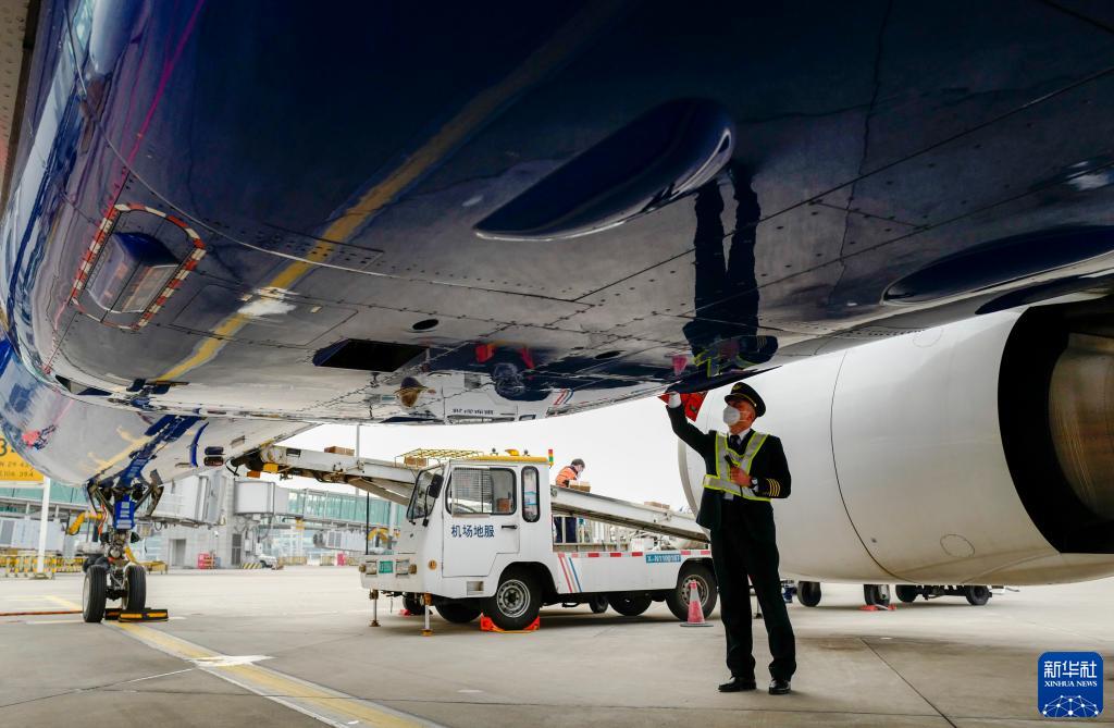 1月6日,重庆江北国际机场的停机坪上,机长菅士博对客机进行起飞前的绕机检查。新华社记者 刘潺 摄