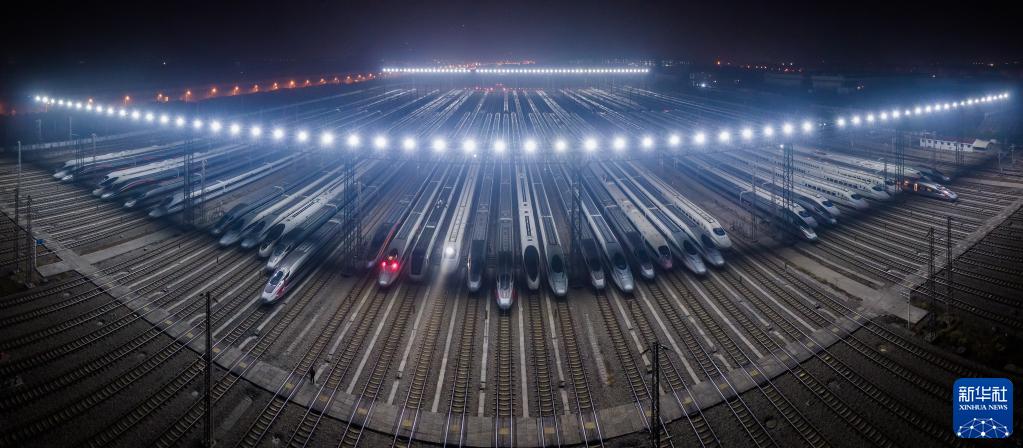 1月7日凌晨,动车组列车停靠在武汉动车段的存车线上(无人机拼接照片)。新华社记者 伍志尊 摄