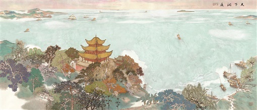 在心里计划好画面中的物象,用草稿定好画作的章法布局,安排好画面中岳阳楼的位置和大小、湖岸与湖面的面积。经历了90多天,四五次的修改,一幅兼工带写,融入青绿山水表现手法的《天下洞庭》呈现出来。